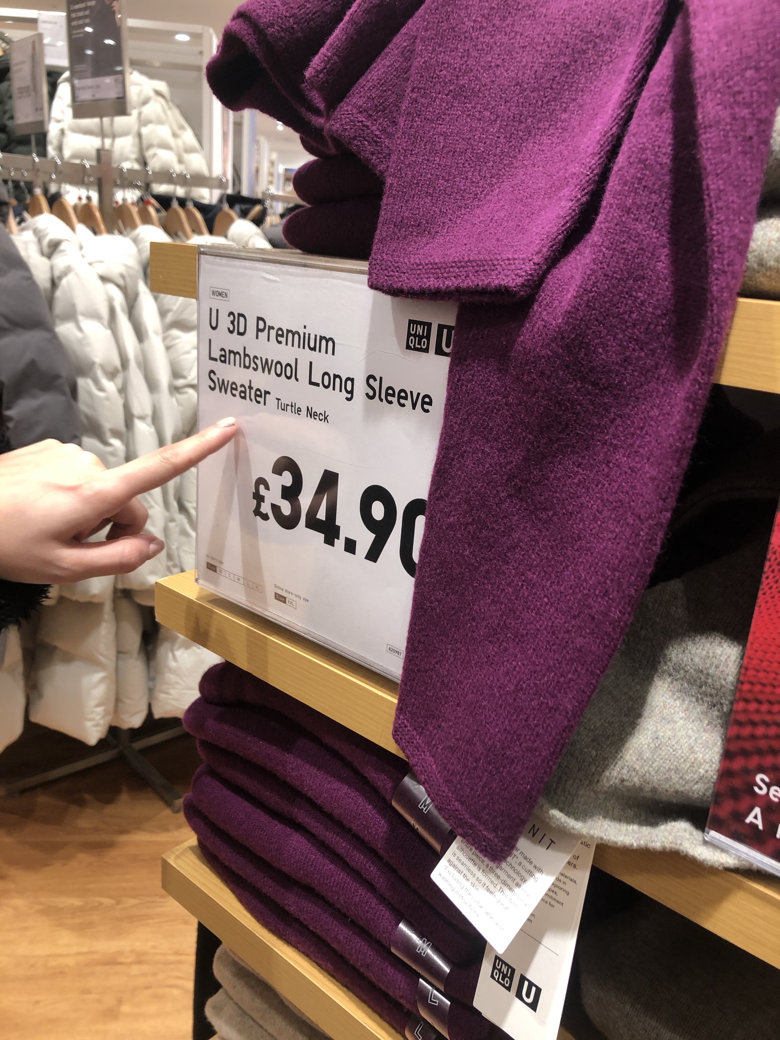 | Select one of the trends in store and describe the garment shapes/fabrics/ print patterns/colour/country of manufacture that make up this trend. One of the trendy clothes sold in the store is a Premium Lambswool long sleeve sweater with a turtle neck. Made by 3d knit – sewn from a single thread, a new dimension in knit technology. Purple colour. The trend is coming from Vietnam. |